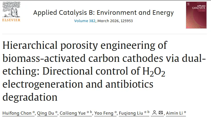 合理设计具有层次化孔结构的生物质活性炭阴极是一个关键的科学挑战。本文以废弃稻壳为原料,采用双重刻蚀策略(H3PO4预刻蚀结合KHCO3再刻蚀),成功构建了一系列具有丰富拓扑纳米通道结构的氮氧共掺杂生物质活性炭P-PBC-X(X=1、4、8)。孔结构分析表明,H3PO4预刻蚀有效优化了生物质活性炭的孔结构分布。因此,P-PBC-4在电催化活化O2降解四环素(TC)过程中表现出最佳性能,其反应速率常数k值达0.1322 min−1,优于多数已报道的研究。线性拟合分析显示,H2O2产率与微孔面积(SMicro)呈显著正相关(R2=0.9041),而介孔体积(VMeso)更有利于TC的降解(R2=0.8324)。密度泛函理论计算表明,氮掺杂和边缘C-O-C基团能有效降低*OOH生成能垒,从而促进2e-氧还原反应过程。本研究显著推动了用于电催化氧活化和抗生素降解的高性能生物质活性炭阴极的理性设计与制备。