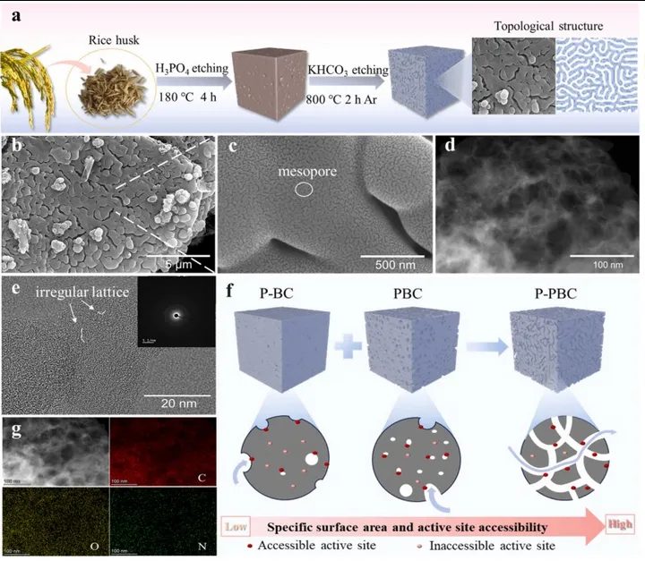 图 1. (a) P-PBC-X材料的合成过程示意图。(b, c) P-PBC-4的扫描电子显微镜图像。(d) P-PBC-4的HAADF-STEM图像。(e) P-PBC-4的透射电子显微镜图像,插图为选区电子衍射花样。(f) 示意图展示了P-BC、PBC和P-PBC-4三种材料活性位点可及性与比表面积的对比。(g) P-PBC-4中C、O、N三种元素的相应EDS能谱及分布图。