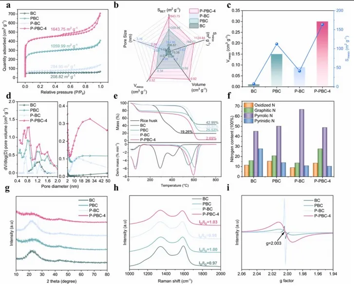 图 2. (a) N2吸附-脱附等温线。(b) BC、PBC、P-BC与P-PBC-4的比表面积、微孔面积、总孔容、微孔容及孔径对比。(c) 基于Barrett-Joiner-Halenda模型计算的BC、PBC、P-BC与P-PBC-4的介孔孔容与介孔面积。(d) BC、PBC、P-BC与P-PBC-4的孔径分布。(e) 稻壳、BC、PBC、P-BC与P-PBC-4的热重(空气气氛)与微分热重曲线分析。(f) BC、PBC、P-BC与P-PBC-4的氮含量分布。(g) BC、PBC、P-BC与P-PBC-4的X射线衍射谱图。(h) BC、PBC、P-BC与P-PBC-4的拉曼光谱。(i) BC、PBC、P-BC与P-PBC-4的固体电子顺磁共振谱图。