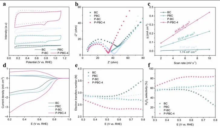 图 3. (a) 循环伏安曲线,(b) 电化学阻抗谱,及 (c) 双层电容值,分别对应 BC、PBC、P-BC 和 P-PBC-4 四种阴极材料。(d) BC、PBC、P-BC 和 P-PBC-4 四种催化剂在 1600 rpm 转速下的旋转环盘电极极化曲线。对应的(e) 电子转移数 (n) 与 (f) H₂O₂ 选择性。