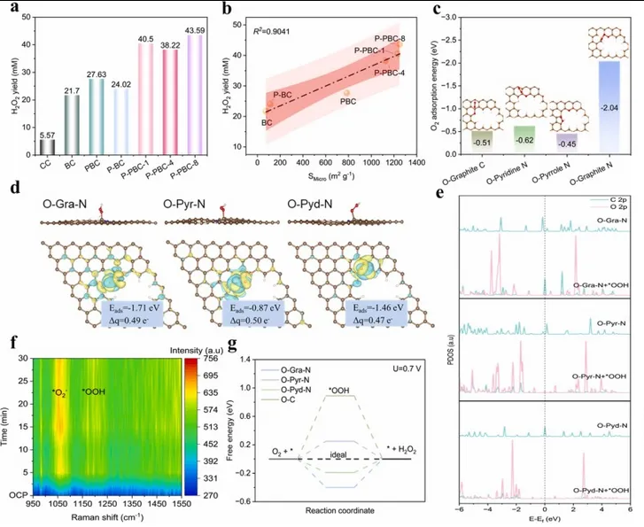 图 4. (a) 碳布及所制备催化剂的H₂O₂产率对比。(b) 微孔面积与H₂O₂产率的拟合曲线。(c) 不同模型化合物上O₂的吸附能。(d) P-PBC-4中O-Gra-N、O-Pyr-N和O-Pyd-N模型的电荷密度差分图。黄色表示电荷积累,青色表示电荷耗散,等值面水平为0.001 e Bohr⁻³(棕色、蓝色和红色分别代表碳、氮和氧原子)。(e) C 2p轨道和O 2p轨道的分波态密度图。黑色虚线表示费米能级。(f) P-PBC-4的原位拉曼光谱。(g) 在不同模型表面(O-Gra-N、O-Pyr-N、O-Pyd-N、O-C)施加U = 0.7 V电压时,2e⁻-ORR过程的吉布斯自由能图。