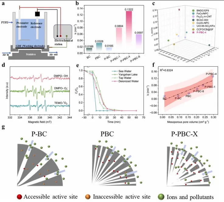 图 5. (a) 反应装置示意图。(b) 所制备催化剂的四环素降解实验。(c) P-PBC-4 与已报道电催化剂的四环素降解性能对比。(d) 在 P-PBC-4 体系中,使用 DMPO 和 TEMP 捕获剂检测到的·OH、¹O₂ 和·O₂⁻ 的 ESR 谱图。(e) P-PBC-X 在不同实际水体中的四环素降解性能。(f) 介孔孔容与反应速率常数 k 值的拟合曲线。(g) P-BC、PBC 和 P-PBC-4 材料微-介孔结构内污染物传输示意图。