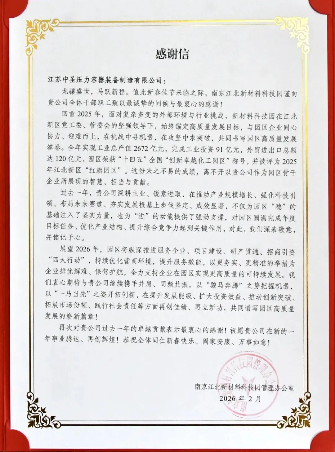 近日,中圣装备公司收到国家级江北新材料科技园送来的感谢信。在信中,园区充分肯定了中圣装备公司深耕主业、锐意进取,在推动产业规模增长、强化科技引领、布局未来赛道、夯实发展根基等方面取得的骄人成绩。