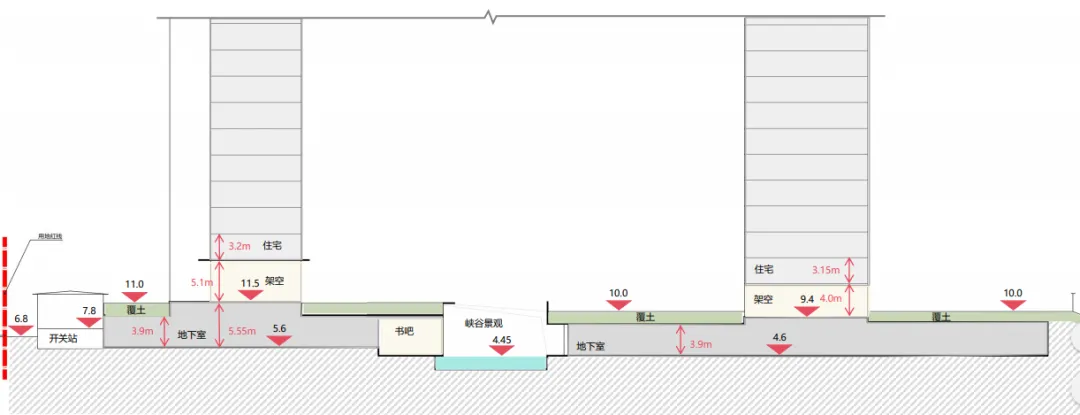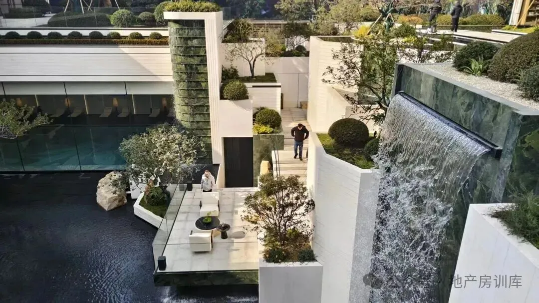 为了营造出超2000平“峡谷”垂直跌水景观,项目顺应起伏地势,充分利用“一体抬高底板”与中央庭院下挖,最大做到了深达约7米的惊人“落差”!(意味着即使从二楼向下望去,峡谷自然山林感依然会无比强烈)。
