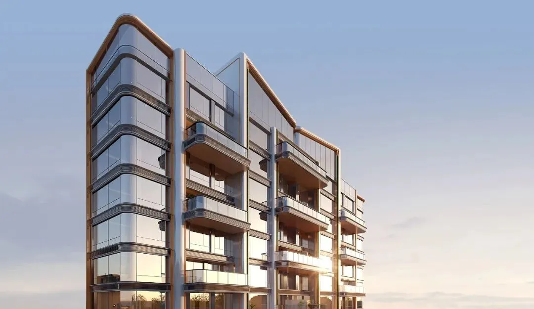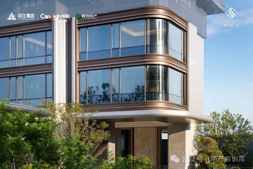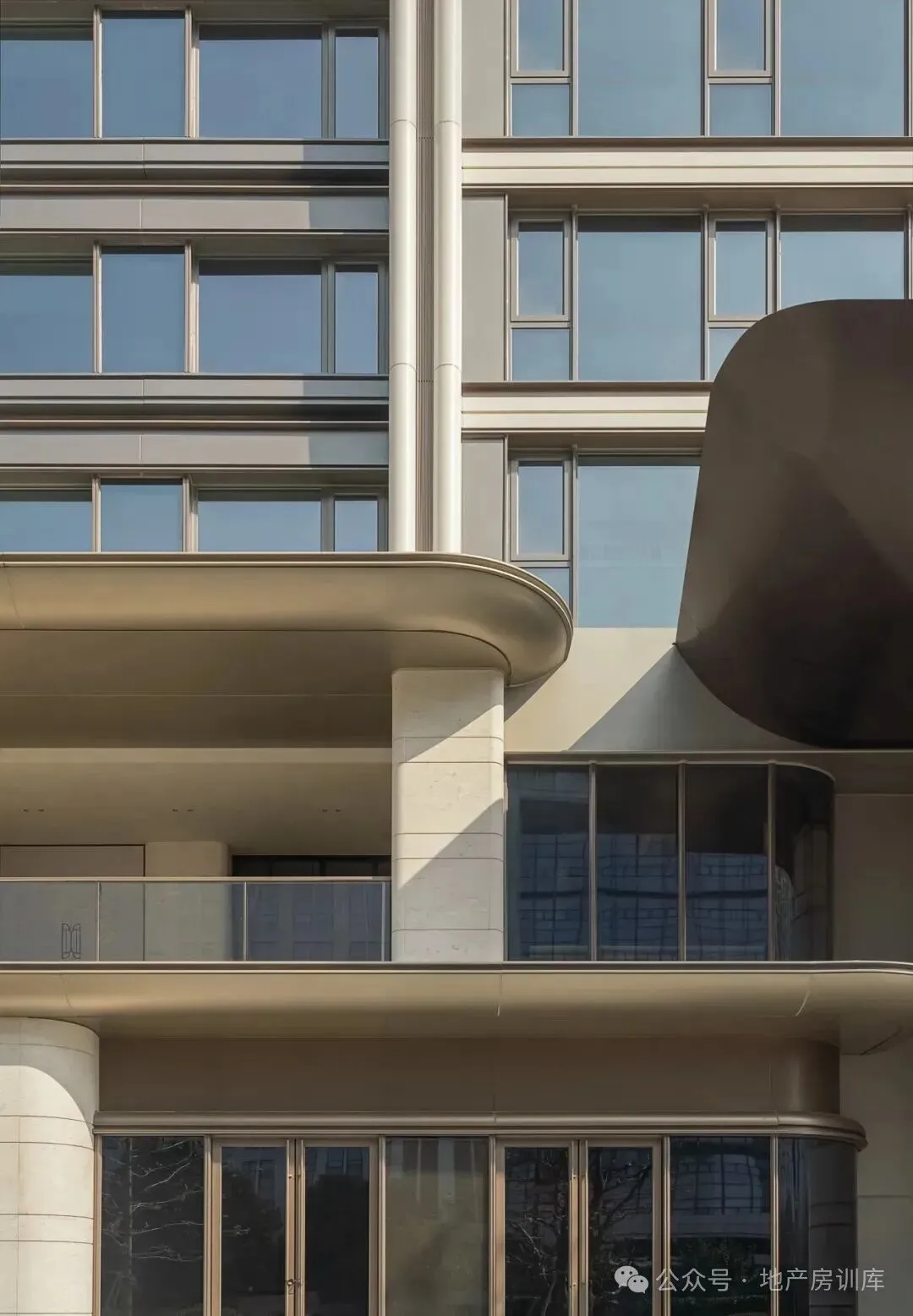 杭序府的外立面采用弧线转角阳台+蓝灰色钢化LOW-E玻璃,公建化立面拥有超高窗墙比。同时,大量曲线元素的运用,不仅造价昂贵,而且极具辨识度,成为区域的颜值担当。