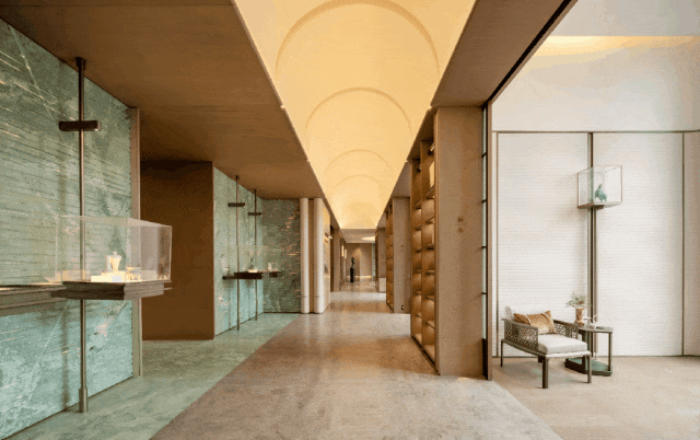 约63米超尺度门庭,地面通铺宇宙黑奢石,沉稳内敛;约13X5.5米的铜门,由匠人运用4种非遗工艺,手工锻打出独一无二的潮涌锤纹。