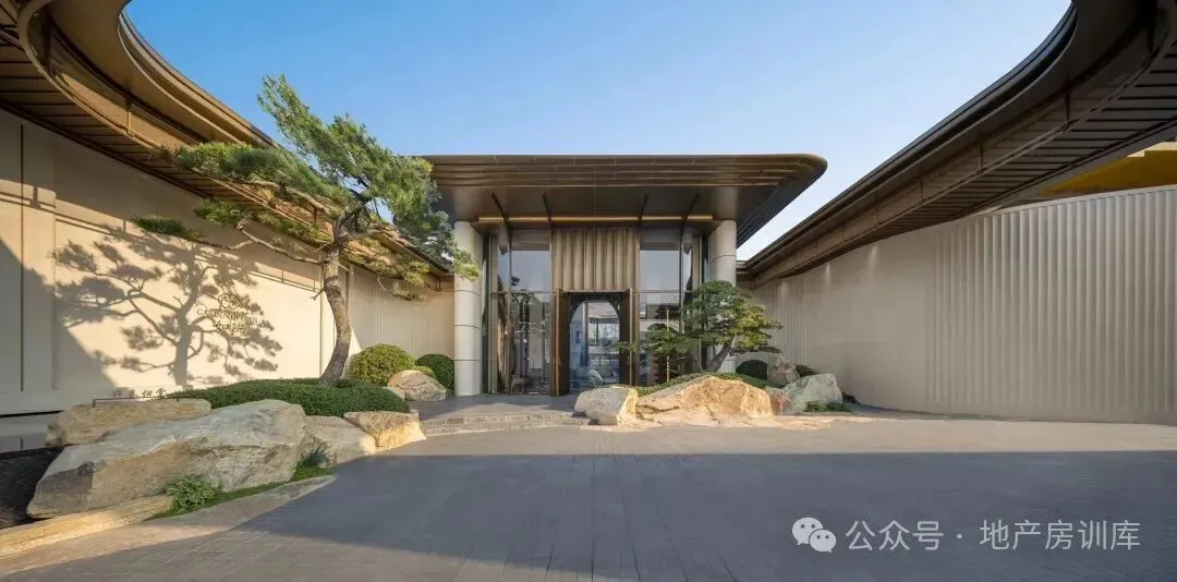 运河樾的园林感,几乎从门头就开始了:贯穿的水系、奢石景墙之上的玉石飘带,都像是把运河的水给引了过来,再配上金色的坡屋顶,很有江南院落的雅贵气质。