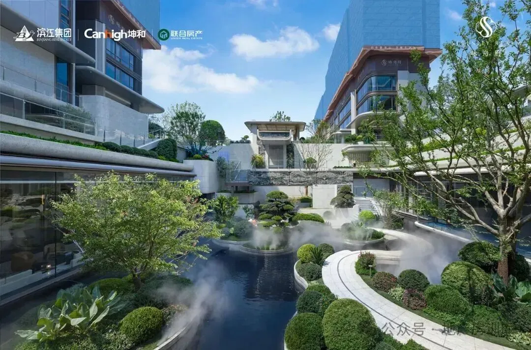景观由JTL王小波团队执笔,以“城市山林”为理念,融合山石、玉雕与枫林元素,营造“石开玉出”的东方意境。设计以山为骨、水为脉,呼应杭州“山水交织”的在地风貌,通过建筑与植被的层次布局,在空间中再现宋画《浮玉山居图》的幽远气韵,回应居者“诗意栖居”的精神向往。