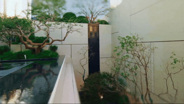 锦上观澜的下沉庭院,拥有约6米的自然高差,构成一座被自然环抱、风景沉浸的私家花园,借鉴艺术家的光影魔法,勾勒出一个层次丰富、光影流动的场所。