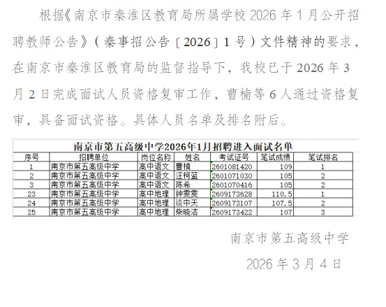 南京市第五高级中学2026年1月公开招聘教师进入面试人员名单公告