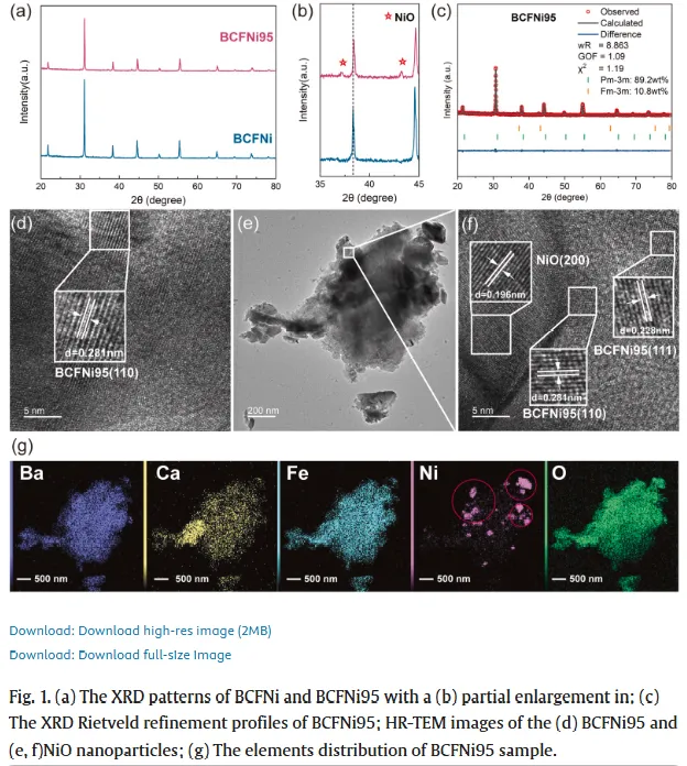 南京工业大学崔升教授团队提出A位缺陷工程策略,通过在 (Ba0.8Ca0.2)0.95Fe0.8Ni0.2O3-δ体系中诱导NiO原位外生,构建高效NiO|BCFNi95异质界面。该策略不仅显著改善金属-氧键与表面催化活性,还实现了峰值功率密度1781 mW cm−2及优异电解性能。