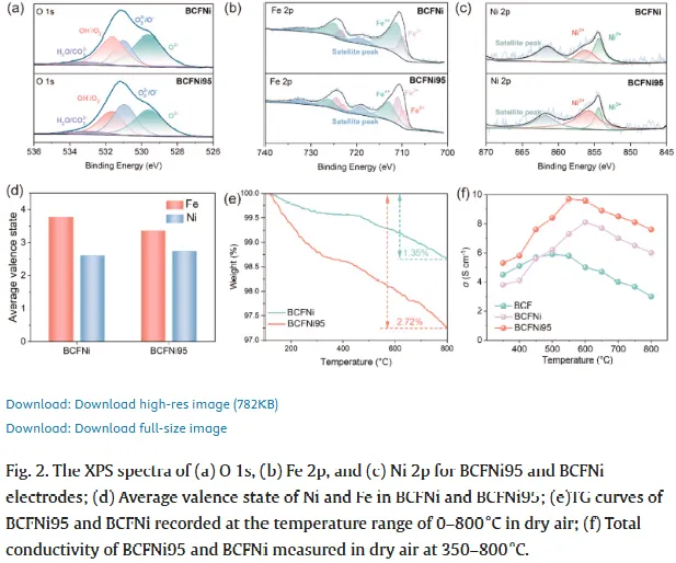 亮点二|降低氧空位与水化能工作内容:DFT计算显示BCFNi95氧空位形成能降低至−0.69 eV,水化能为−2.77 eV。研究价值:降低能垒有助于氧/质子快速迁移,提升ORR/OER反应动力学,实现电极高性能。