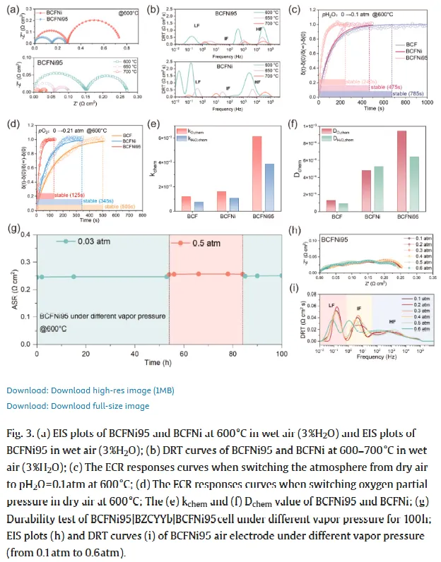 亮点四|耐久性优异工作内容:在高蒸汽压条件下连续100 h测试,BCFNi95电极几乎无性能衰减。研究价值:异质界面与缺陷协同作用赋予电极动态自调节能力,显著增强长期稳定性。