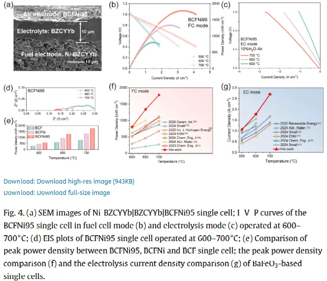 亮点三|电化学性能显著提升工作内容:BCFNi95空气电极峰值功率密度1781 mW cm−2,电解模式下电流密度达2.70 A cm−2,ASR降至0.035 Ω cm2。研究价值:实现比未掺杂电极高136%功率输出,展现出缺陷工程与异质界面协同增强效应。