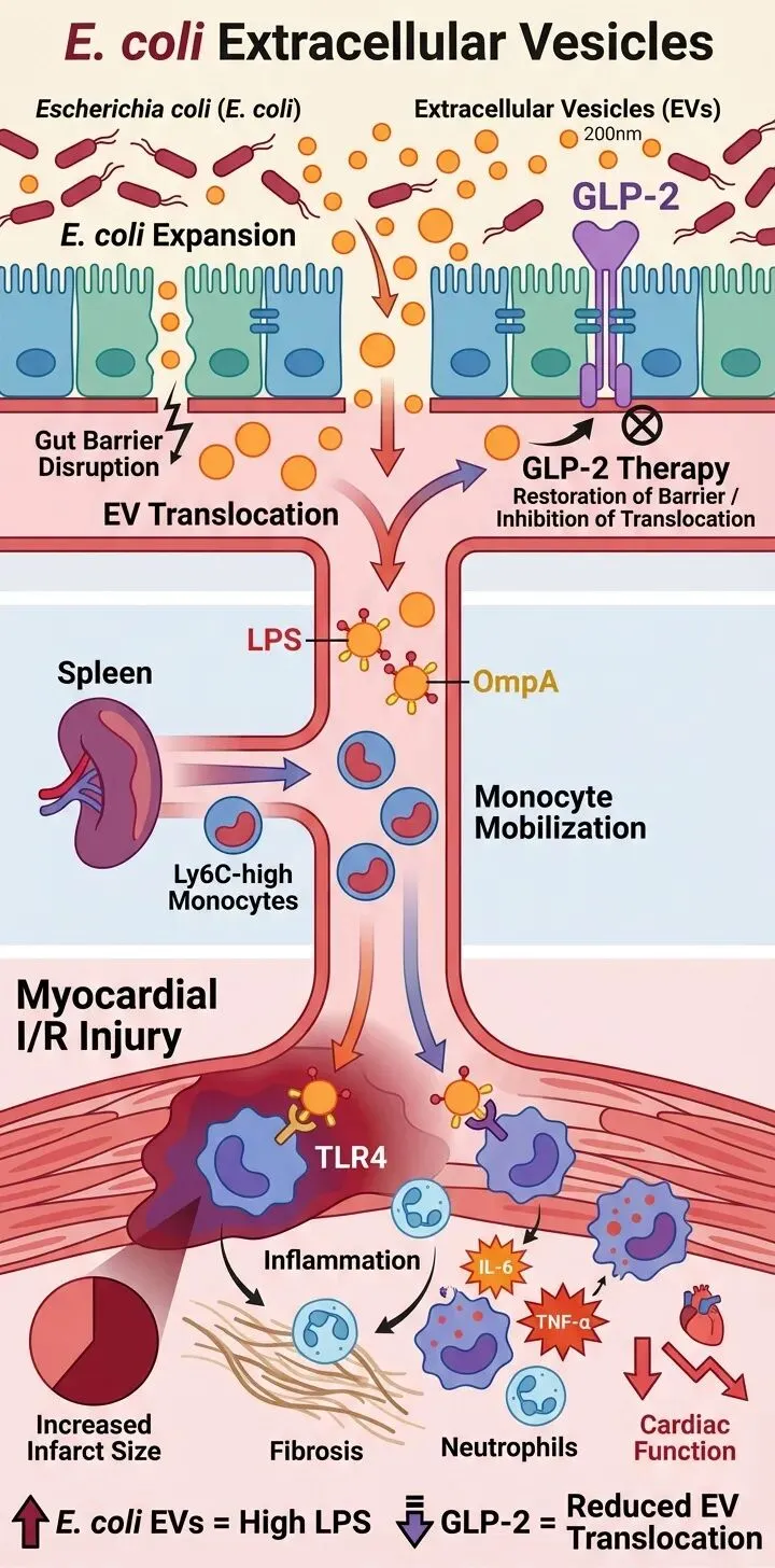 这项研究首次系统性揭示了肠道细菌囊泡在心肌缺血再灌注损伤中的有害作用,并明确了其作用路径:损伤导致肠道屏障破坏 → 大肠杆菌囊泡携LPS等物质入血 → 加剧系统性与局部心脏炎症 → 恶化心脏损伤与功能。通过GLP-2靶向肠道屏障的干预策略,为未来开发保护心脏的新疗法提供了全新视角。