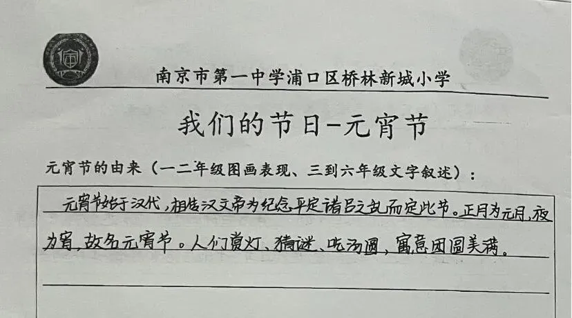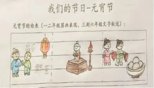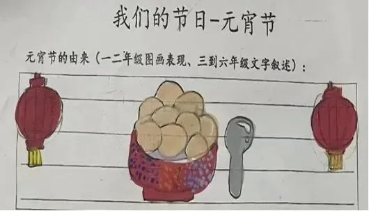 元宵节的由来,你知道多少?低年级的孩子们用画笔描绘心中的元宵故事,五彩斑斓的画纸上,是他们对节日的纯真理解;高年级的同学则用文字追溯元宵节的起源与演变,从汉文帝时期的“诸吕之乱”,到唐宋年间的灯市繁华,一笔一划间,尽显对传统文化的探寻与敬仰。孩子们在查阅资料、认真作答中,不仅了解了元宵节的历史渊源,更在心底埋下了文化传承的种子。