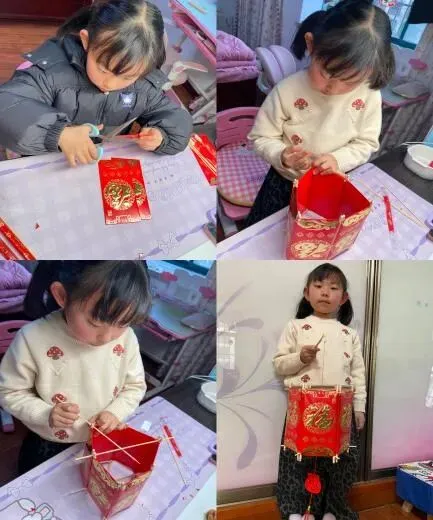 废旧物品也能变身创意灯笼!孩子们发挥想象力,用彩纸、卡纸、小灯串等材料,动手制作出一个个独具匠心的元宵灯笼。剪、贴、扎、系……每一个步骤都凝聚着孩子们的专注与巧思。有的灯笼如圆月当空,有的灯笼似鱼龙舞动,点亮的那一刻,仿佛将整个元宵节的灯火都收入掌中。小小灯笼,不仅照亮了节日的夜晚,更点亮了孩子们心中对传统文化的热爱。