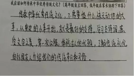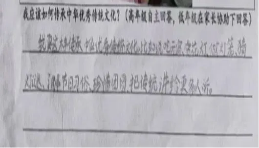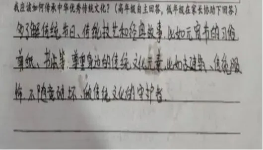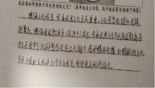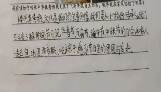 “我该如何传承中华优秀传统文化?”这是留给孩子们的思考题,也是家校共育的美好话题。在家长的引导下,孩子们用稚嫩的话语写下自己的理解与承诺:“我要从小学习传统节日,记住节日故事,长大后把中华文化讲给更多人听。”一句句真挚的话语,是对文化传承最朴素的回应,也是家校携手共育的生动见证。家长们也纷纷表达对传统文化传承的期许,让文化的力量在温情中传递,在陪伴中扎根。