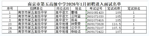 根据《南京市秦淮区教育局所属学校2026年1月公开招聘教师公告》(秦事招公告[2026]1号)文件精神的要求,在南京市秦淮区教育局的监督指导下,我校已于2026年3月2日完成面试人员资格复审工作,曹楠等6人通过资格复审,具备面试资格。具体人员名单及排名附后。
