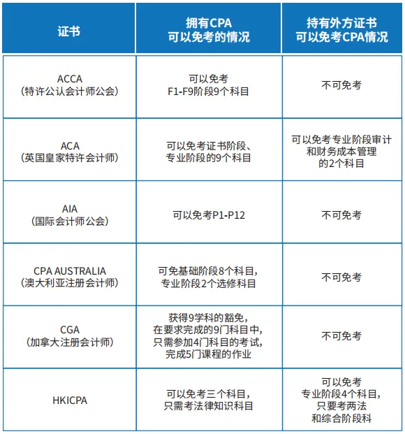CPA证书可免考ACCA、AIA、ACA等多个国际高端财经证书的科目考试。