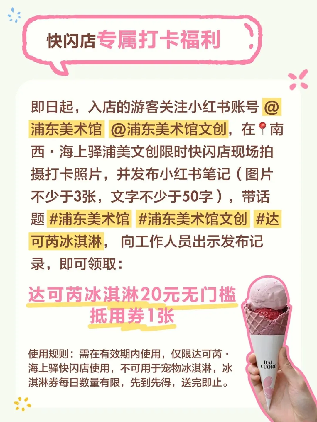 📸 即日起,入店游客关注🍠账号 @浦东美术馆 @浦东美术馆文创 ,在📍南西·海上驿浦美文创限时快闪店现场拍摄打卡照片,并发布🍠笔记(图片不少于3张,文字不少于50字),带话题 #浦东美术馆 #浦东美术馆文创 #达可芮冰淇淋 , 向工作人员出示发布记录,即可领取:达可芮冰淇淋20元无门槛抵用券1张。