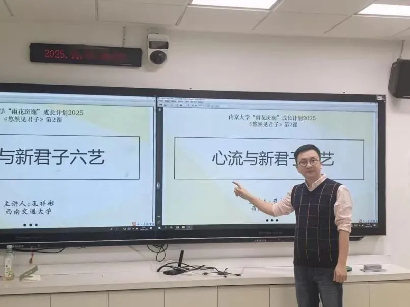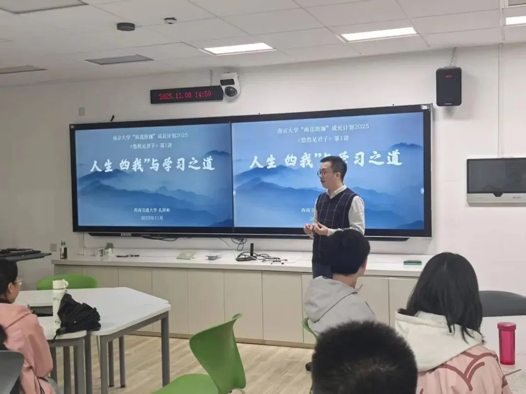 11月8日,孔祥彬老师前往南京大学开讲《悠然见君子》系列课程第一讲。本次授课主题为:人生“四我”与学习之道。孔祥彬老师首先播放了沈志云院士对大学生的寄语,提醒大学生要“站起身来,眺望四方”,不要被优绩主义限制了自己的全面发展。