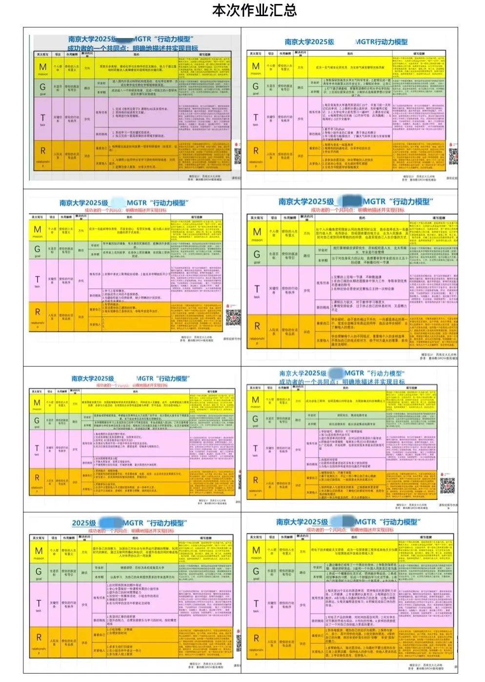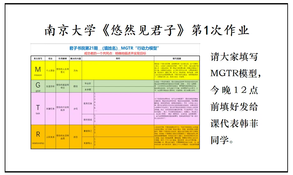 在进入大学后的这一段时间里,说实话,自己依旧是有点迷茫无措的,高中时期的努力通过成绩可视化,而大学的成长似乎难以察觉,我常常会觉得自己碌碌无为,慢慢丧失了过去那种奋发向上的动力,怀疑自己学习人文学科的意义。而在这堂课中,老师教我们同古人一般作揖行礼、探索学习的意义、四我概念、GROW模型、高校毕业生需要具备的能力建议以及课后布置的立flag计划和MGTR动力模型......这些都引导着我成为更好的自己、走向社会、重视实践能力并学会利他,这也让我想到高中时期的校训“成就最好自己,服务祖国人民”。