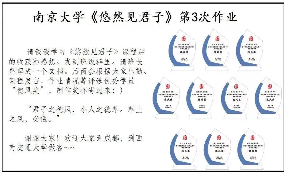 三次课的时间很短,收尾时竟有“怅然若失”的不舍——舍不得课堂上思维被点亮的时刻,也舍不得那种“向内看”的平静。特别感谢孔老师,以“君子之德”为引,让我们在浮躁里找到了自己的方向。也盼着日后能再道一句“吾师好”,续上这堂关于“成为自己”的课。