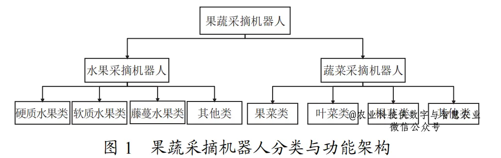 农业采摘机器人是农业机器人典型代表,用于选择性采收成熟农产品,其融合了成熟度检测、采摘点定位、机械臂控制、自动导航技术等,目的是为了在复杂的农业环境下高效、精准的完成采摘任务,降低人工成本,提高采摘效率。据国内外采摘机器人研究的主流分类形式,采摘机器人可按照作业对象大致分为水果类采摘机器人与蔬菜类采摘机器人两大类别。具体功能架构详见图1所示的分类体系。