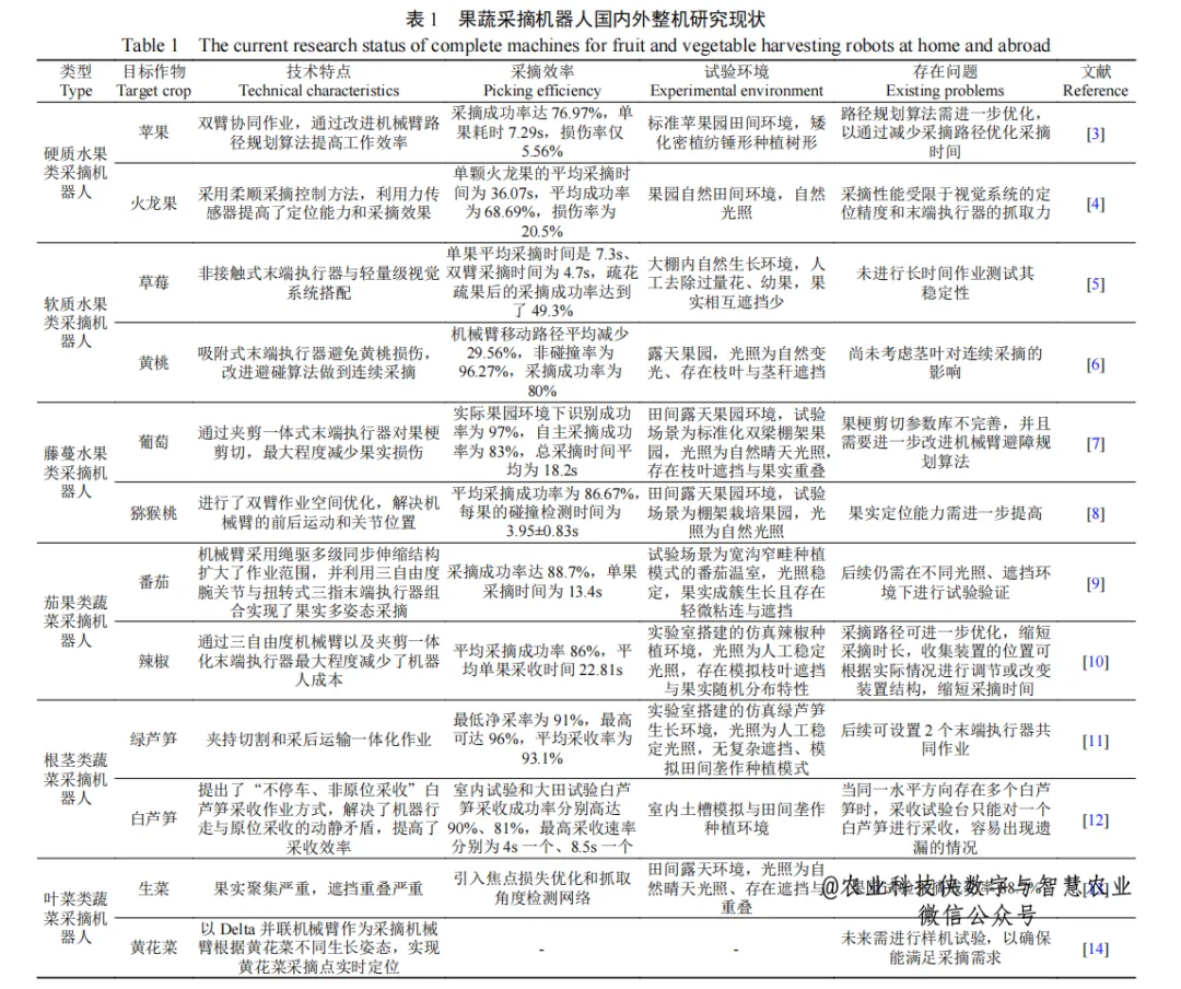 随着人工智能、机器视觉、软体机器人等技术的飞速发展,全球范围内的采摘机器人正从实验室原型机向商业化落地快速迈进。总体来看,国外研究起步早,技术积累深厚,商业化程度更高;而国内研究近年来发展迅猛,在国家政策的大力支持下,已在多个领域取得关键突破,应用前景广阔。表1概述了目前果蔬采摘机器人的国内外研究现状汇总。