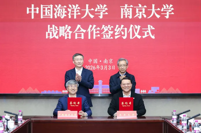 在谈哲敏、张峻峰的共同见证下,中国海洋大学党委常委、副校长刘勇,南京大学党委副书记陈云松代表双方签署战略合作协议。