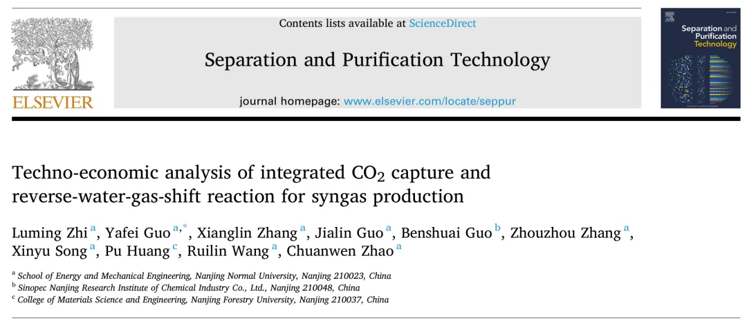全球变暖和碳中和共识推动了CO₂减排技术的快速发展。碳捕集、利用与封存(CCUS)是关键路径,但其商业化部署受限于CO₂分离、压缩和运输的高能耗与高成本。集成碳捕集与利用(ICCU)技术应运而生,通过双功能材料(DFMs)在单一反应器内实现原位CO₂捕集与转化,绕过能耗密集的中间步骤。ICCU-RWGS(逆水煤气变换)路径可生产合成气(CO与过量H₂),用于合成甲醇、燃料和化学品,具有广阔的工业脱碳前景。然而,现有技术经济评估(TEA)多聚焦于合成DFMs,低成本天然矿物或碱性固体废弃物的潜力尚未充分探索,且缺乏全面的生命周期评估(LCA)。南京师范大学郭亚飞课题组以天然白云石颗粒作为无催化剂双功能材料,开展ICCU-RWGS工艺的全面技术经济与生命周期评估,并与两种传统CCU工艺(胺法捕集+催化RWGS的CCU-1、钙循环捕集+催化RWGS的CCU-2)进行对比。相关研究成果发表于国际著名期刊《Separation and Purification Technology》。