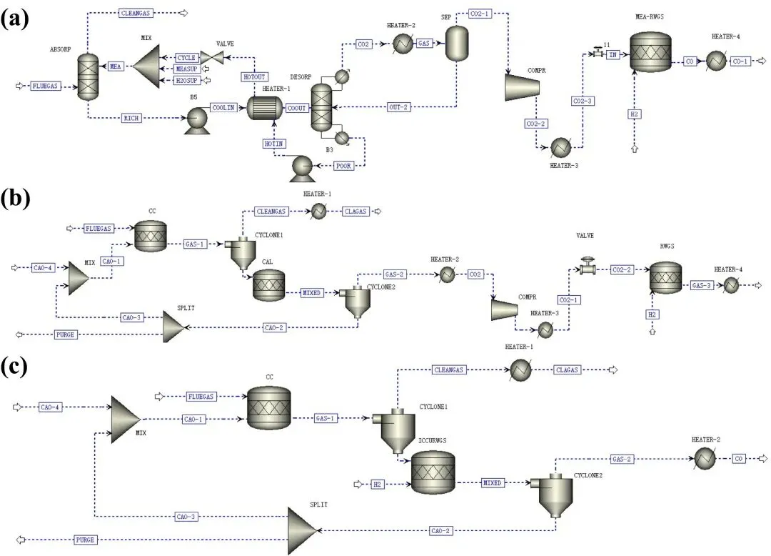 图1. 采用Aspen Plus®模拟的三种工艺流程示意图:(a) CCU-1模型;(b) CCU-2模型;(c) ICCU-RWGS模型。