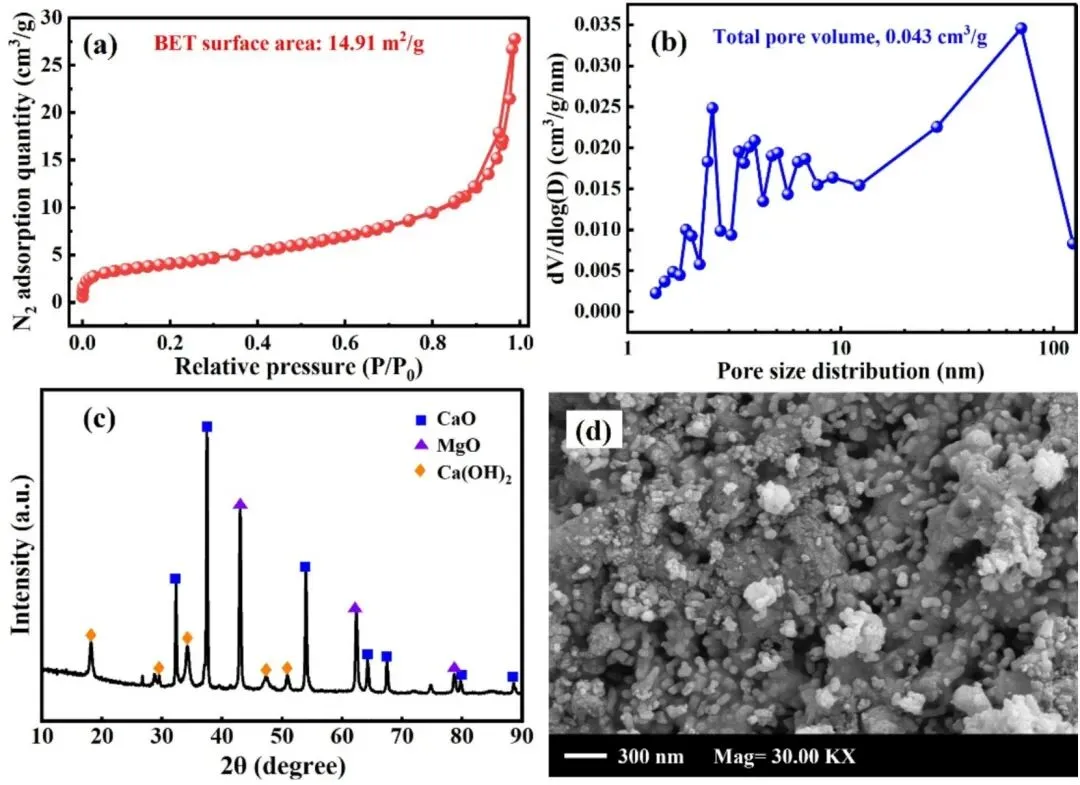 图2. 白云石衍生DFMs颗粒的结构表征[25]。(a) N₂物理吸附等温线;(b) 孔径分布曲线;(c) XRD图谱;(d) 场发射扫描电镜图像。