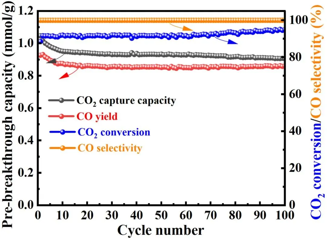 图4. DFMs颗粒在100次ICCU-RWGS循环中的长期工作稳定性。