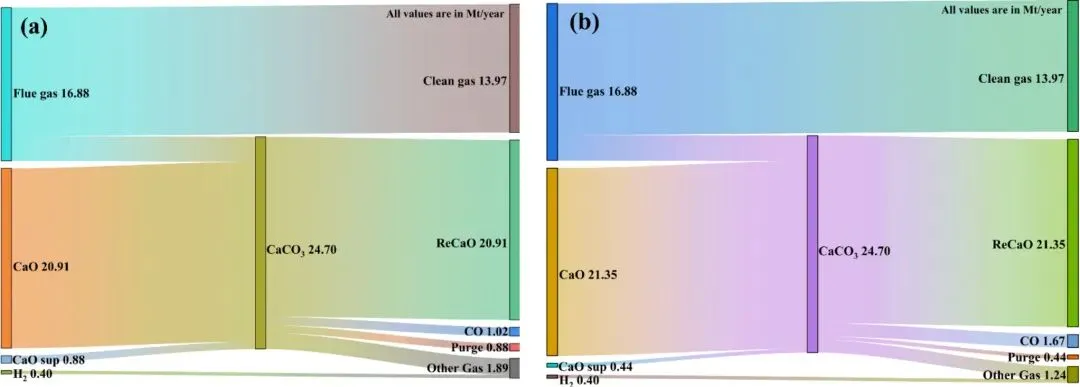 图5. (a) CCU-2和(b) ICCU-RWGS过程的质量流桑基图。