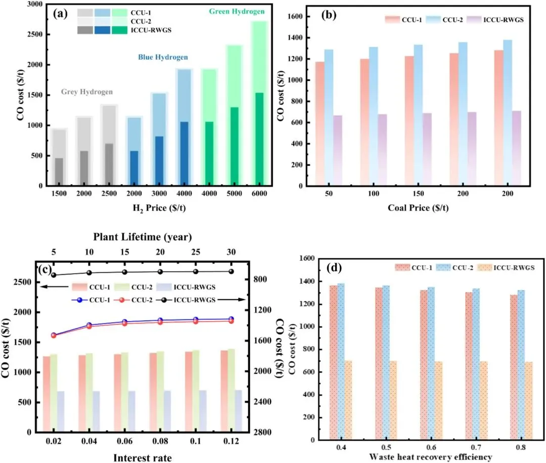 图9. 关键变量对CCU与ICCU工艺CO成本影响的敏感性分析。(a) H₂价格;(b) 煤价;(c) 设备寿命与年利率;(d) 废热回收效率。