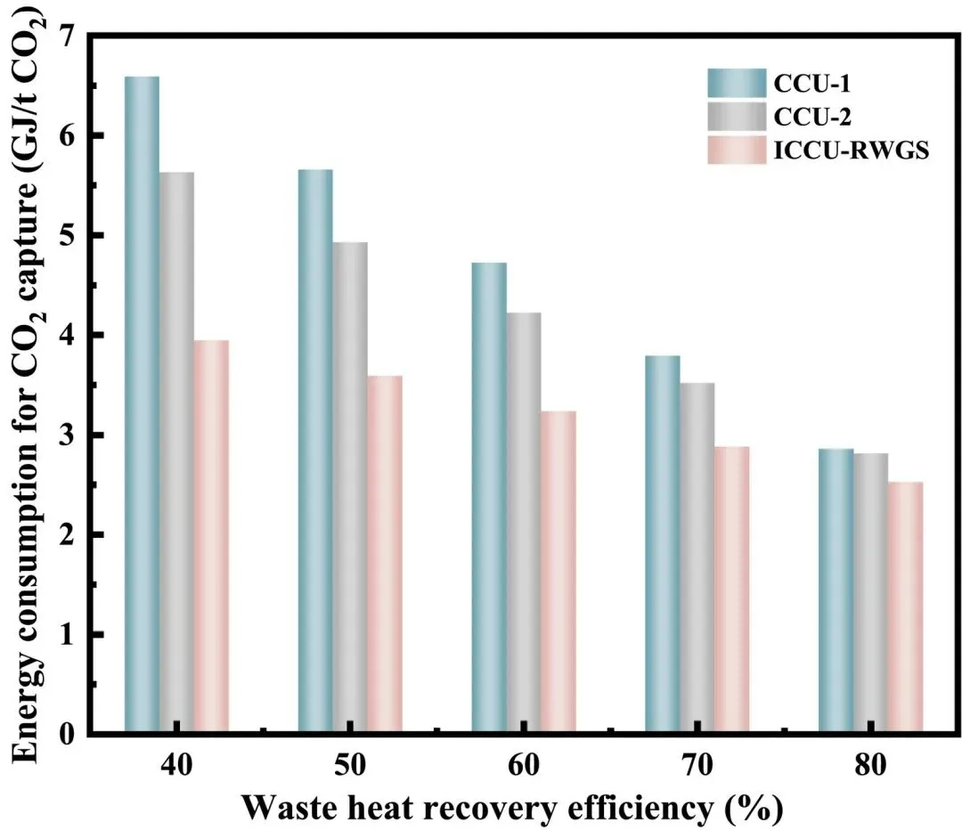 图10. 废热回收效率对CO₂捕集能耗的影响。
