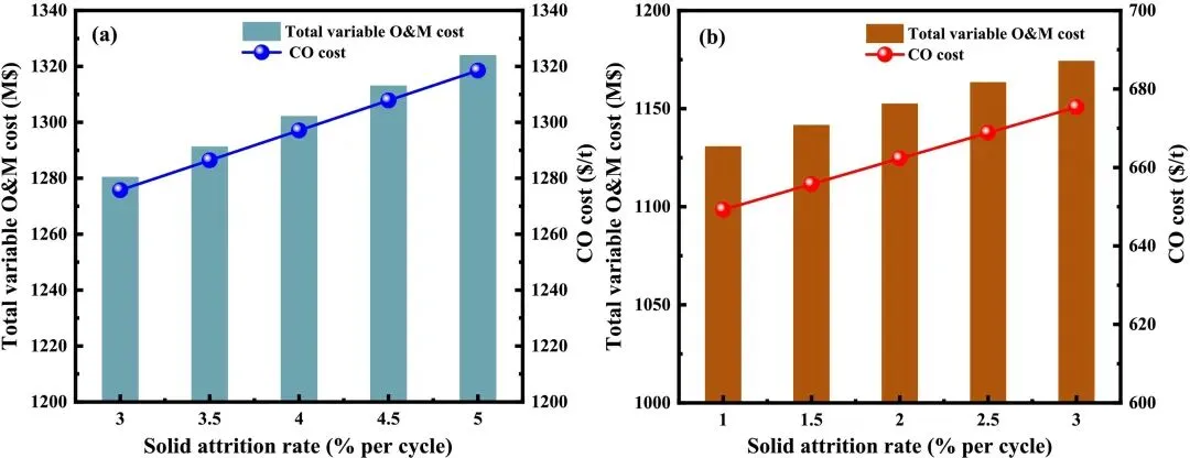 图11. 固体磨损率对(a) CCU-2和(b) ICCU-RWGS总可变运维成本及CO成本的影响。
