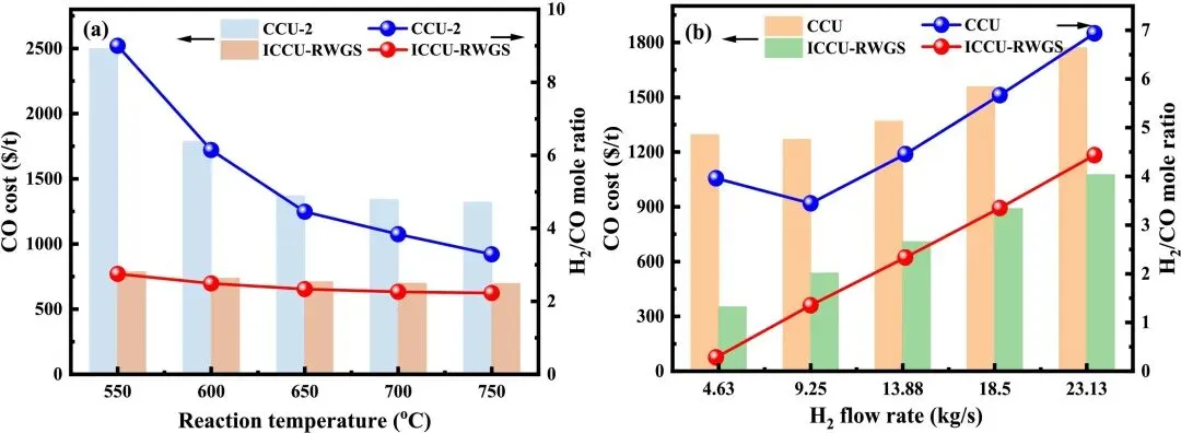 图12. (a) 反应温度和(b) H₂流量对CCU-2与ICCU-RWGS的CO成本及H₂/CO摩尔比的影响。
