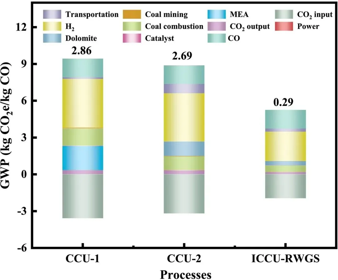 ICCU-RWGS工艺在技术经济和环境性能上均显著优于传统CCU工艺。该工艺实现最低碳捕集能耗(3.10 GJ/tCO₂)和最高能效(42.40%),CO₂减排成本最低(569.92美元/吨)。LCA证实ICCU-RWGS碳足迹最低(0.29 kg CO₂e/kg CO),较对比工艺低一个数量级。该工艺对氢价波动具有更强的经济韧性,且可通过调节操作参数灵活调控合成气H₂/CO比例(1-4),适配下游费托合成需求。研究为低成本、高效ICCU-RWGS技术的规模化部署提供了理论与数据支撑,验证了ICCU作为高排放工业脱碳实用路径的可行性。