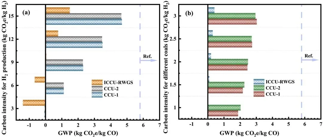 图14. 关键变量对CCU与ICCU工艺全球变暖潜势(GWP)影响的敏感性分析。(a) H₂生产的碳强度;(b) 不同煤种的碳强度。
