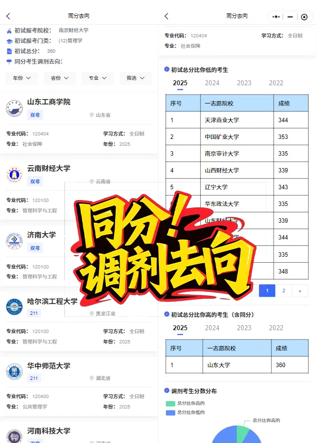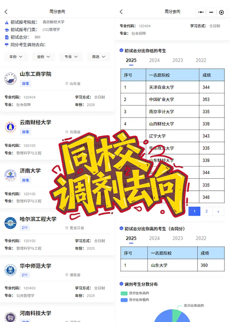 输入你的分数和一志愿,查询往年和你情况相似的考生最终调剂去了哪些院校,给你的志愿填报提供真实参考,避开踩坑。