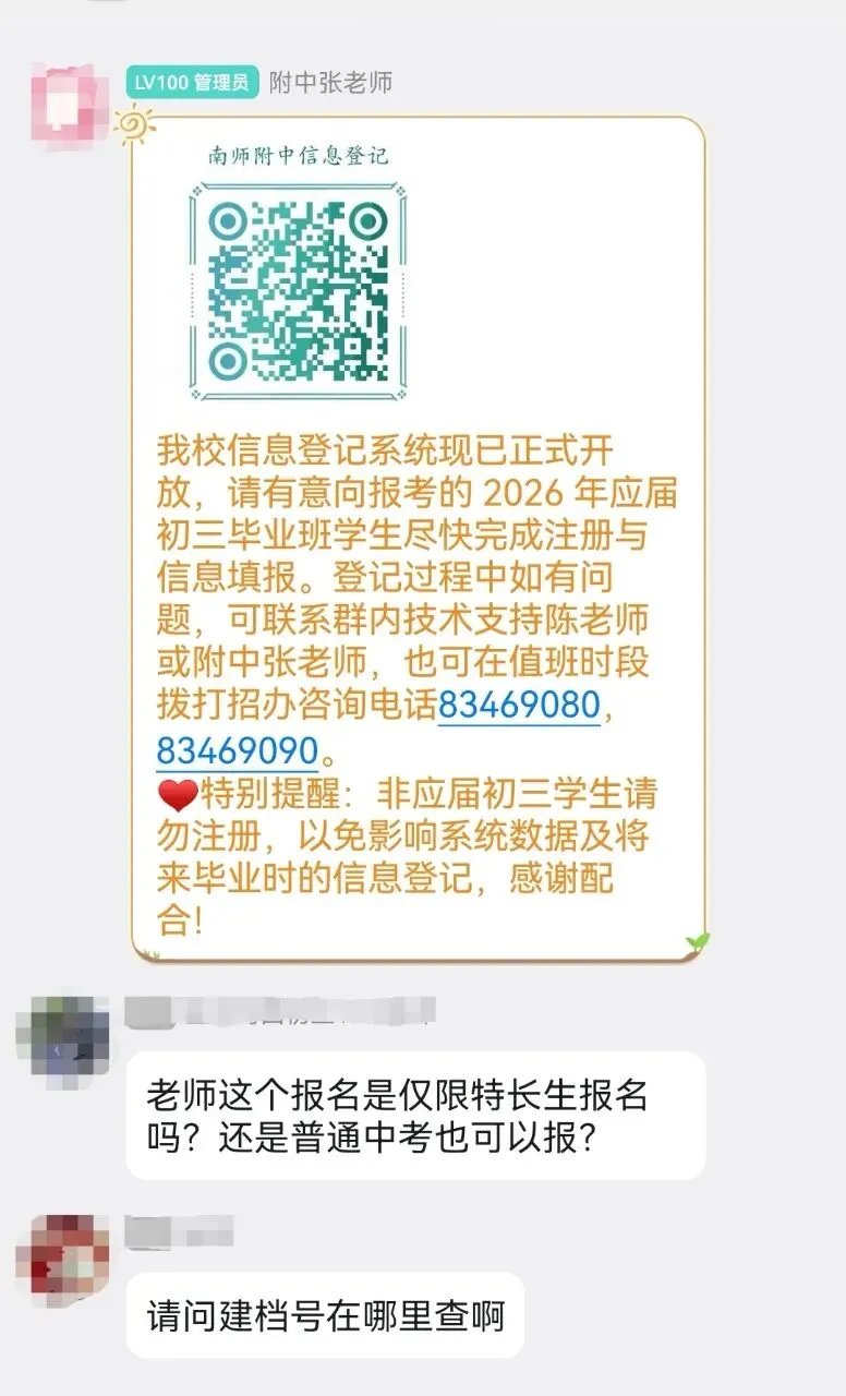 近日,南师附中、金中、中华、南师江宁、建邺高中率先开启中招信息登记(含特长生),有意向的家长赶快登记,后续会有越来越多的学校开启信息登记,名校通老师会第一时间更新在群内,可以扫码进群↓