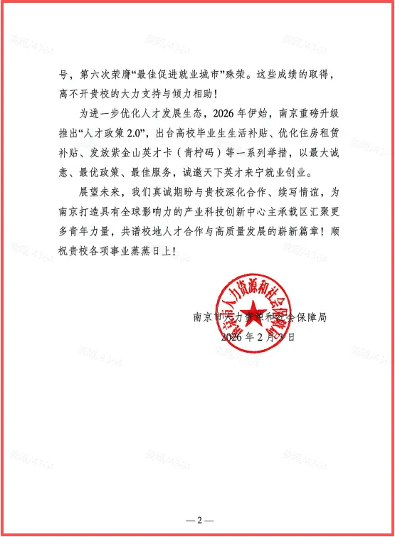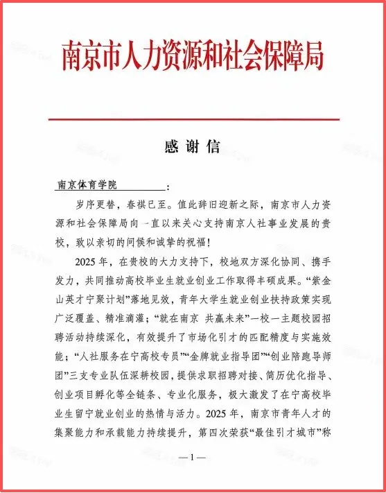 近日,南京市人力资源和社会保障局向我校发来感谢信,对我校在2025届毕业生就业工作中所付出的努力和取得的成绩表示充分肯定和衷心感谢。来信充分肯定我校积极响应号召、通过开展系列就业创业活动拓宽毕业生机会,为全市稳就业保民生大局作出积极贡献,展现了高度的政治站位和责任担当。