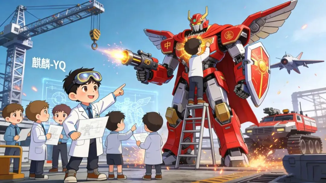 赵昱齐构想了“麒麟-YQ”超级机器人战士:“它的AI大脑藏在胸口的金色能量核里,眼睛是AI摄像头,耳朵是AI声呐,能自己学习、自己升级!”