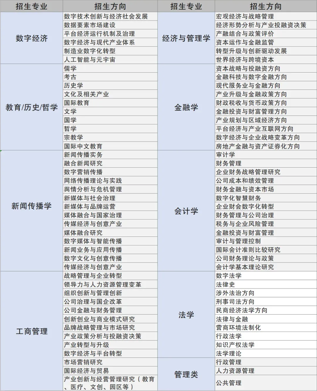 在职博士招生专业包括经济学、工商管理、人工智能、人工智能与科创金融、企业管理、经济管理、数字经济、金融学、财务管理、会计学、财务金融与公司治理、审计与管理控制、战略管理、文学、数字人文、古典文学与传统文化、中国文化与哲学、影视文学、新媒介创作、传媒与品牌营销等(下图)。