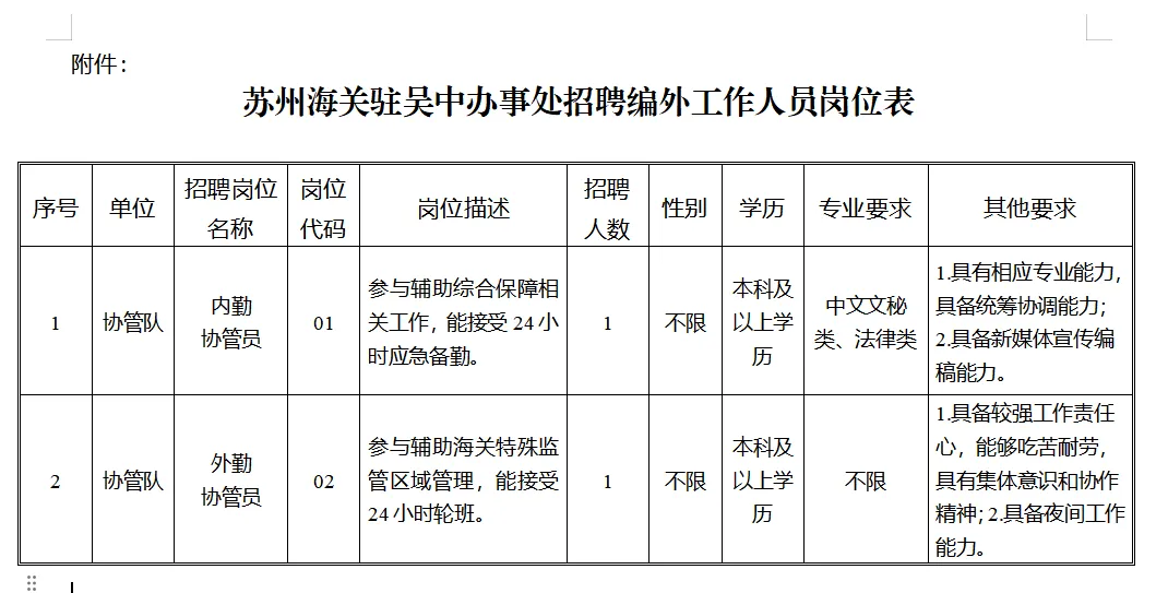 苏州海关驻吴中办事处因工作需要,现面向社会公开招聘编外工作人员2名,现将有关事项公告如下: