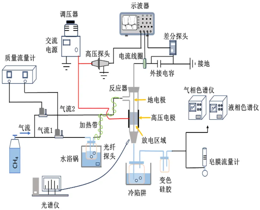 1、本文以同轴单介质DBD反应器为核心,构建了甲烷/水蒸气等离子体重整的一体化实验与表征体系,通过电压-电流波形与Lissajous图形获取放电功率与传输电荷等电学特征,并结合发射光谱对关键活性粒子进行诊断,同时配套气相/液相产物检测与收集流程,从而在“放电行为—活性粒子—产物分布”之间建立可追溯的定量关联框架,为后续工况窗口判定与机理分析提供实验依据。