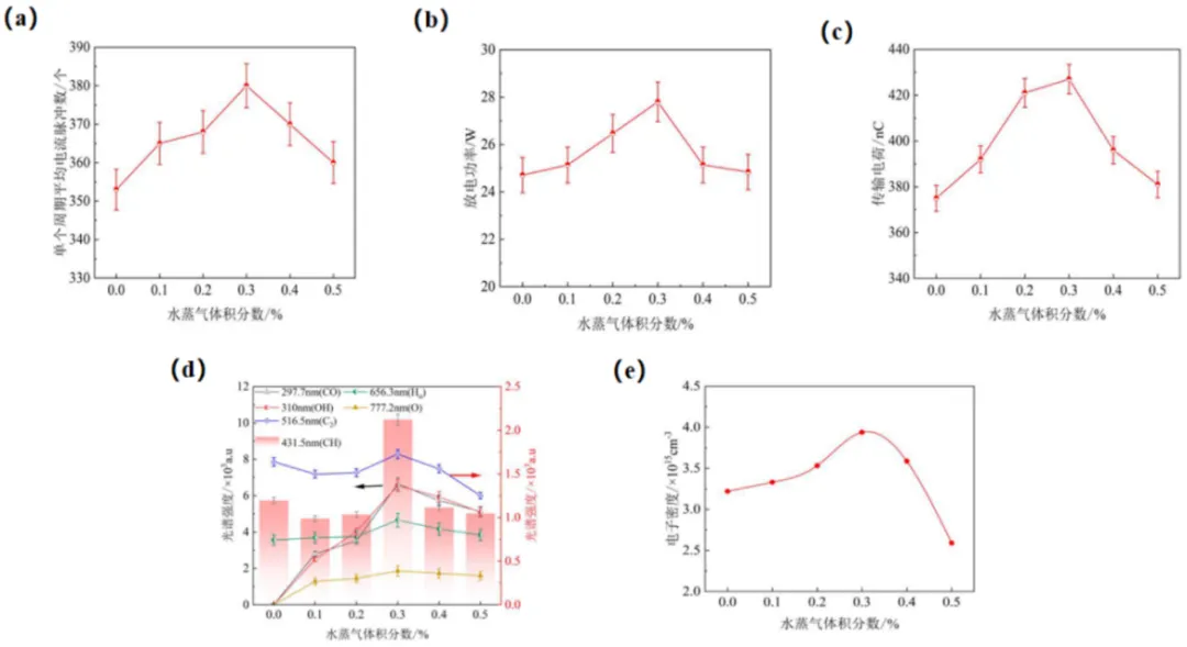 图2 (a)不同水蒸气体积分数下单个周期平均电流脉冲数对比;(b)不同水蒸气体积分数下放电功率对比;(c)不同水蒸气体积分数下传输电荷对比;(d)不同水蒸气体积分数下粒子发射强度变化对比;(e)不同水蒸气体积分数下电子数密度对比